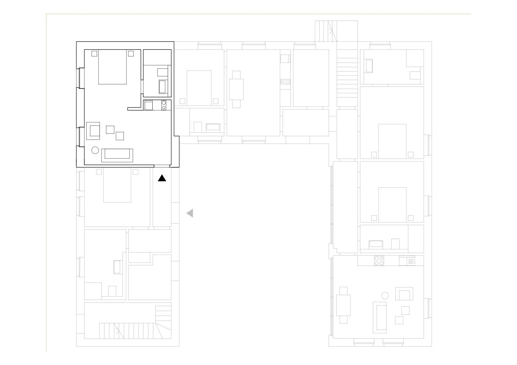 Dieses Studioapartment ist für 2 Personen (mit Kleinkind) geeignet. In der Wohnung befinden sich ein Schlafbereich (Doppelbett; 1,60m), ein Badezimmer, und ein Essbereich mit kleiner Küche. Die Wohnung ist ebenerdig. Zusätzlich existiert ein direkter Zugang zum historischen Innenhof mit Sitz- und Essgelegenheiten.